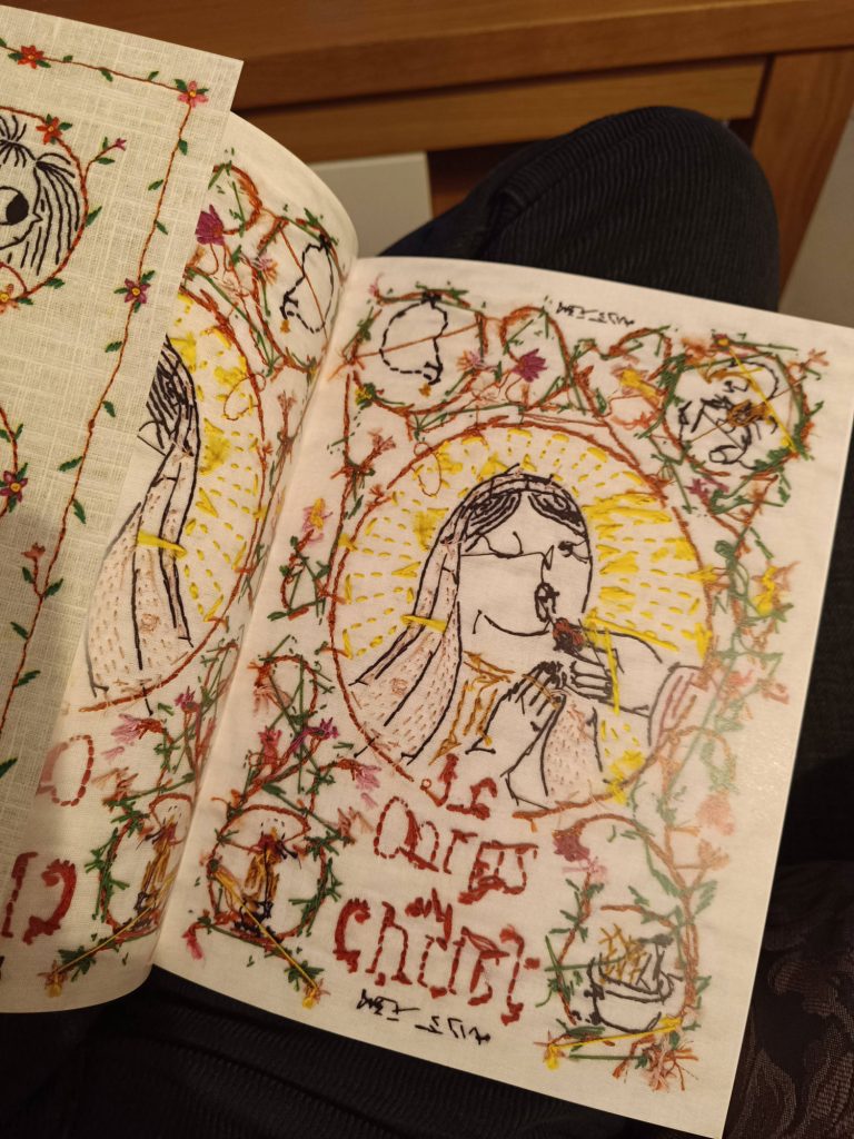 Bea Lema tells us her story, how she grew up with a very religious mom who had an undiagnosed mental disorder. Being scared, not understanding, feeling guilt, having moments of happiness, everything is told through illustrations and EMBROIDERED works of art. Honestly, I can’t imagine how it was to create this book, how Bea Lema planned each page, the hours she spent embroidering and thinking about her story.